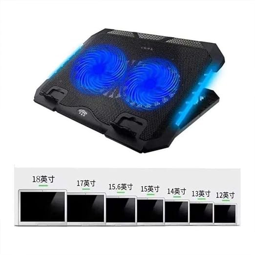 - Ergonomic Desig : Laptop fan cooling pad as an ergonomic stand, with 7 height-adjustable. Also equipped with a detachable non-slip baffle, effectively prevent laptop slipping off. Dual Efficient Fans : The laptop cooling stand has two large fans of 14CM, the fan is equipped with blue LED lights, working voltage: 5V, current: 0.35A, USB cable length: 50 cm. Unique USB Port Desig : Laptop cooler fan with built-in two USB ports, one for connecting laptop USB ports , one for connecting more USB devices .Such as a mouse, keyboard, just plug and play, easy to use.